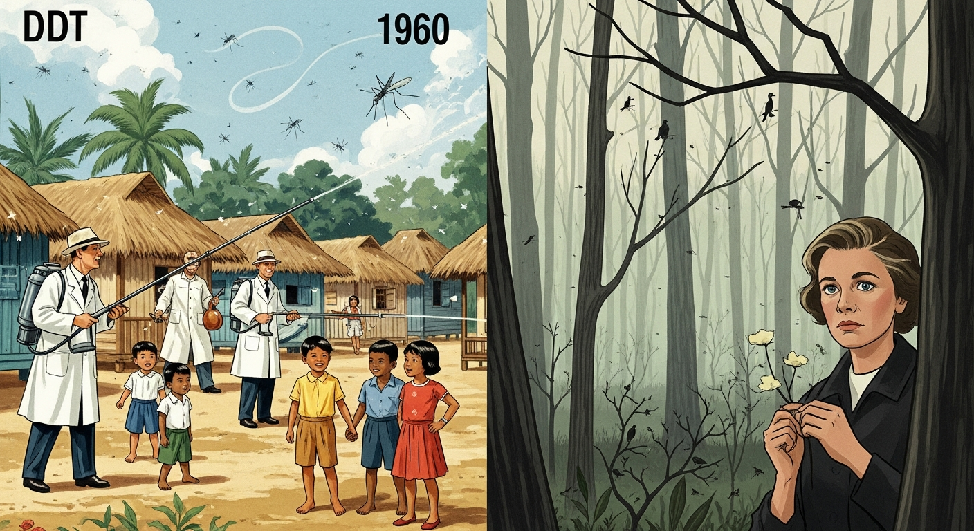 その殺虫剤の名前はDDT(ジクロロジフェニルトリクロロエタン)。DDTは1940年代から1960年代にかけて、文字通り「何百万人もの命を救った」。しかし1962年、一冊の本がその神話を終わらせた。レイチェル・カーソンの『沈黙の春』。DDTは地球の生態系を静かに破壊していた。