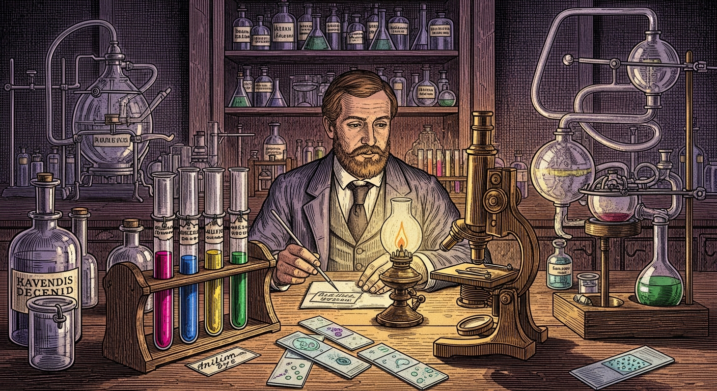 マラリア薬の合成には失敗した。しかし彼が偶然発見した「モーヴ(mauveine)」——世界初の合成染料——は、その後60年にわたって細菌学と化学療法の歴史を動かすことになる。「洋服の色」と「抗生物質」は、同じ化学の子孫だったのだ。