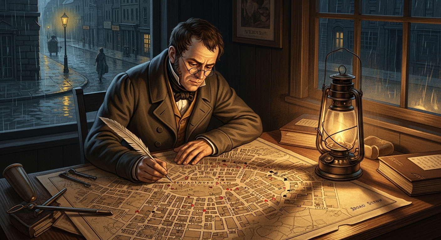 この惨状に、一人の医師が静かに地図を広げた。ジョン・スノウ(John Snow)。彼は顕微鏡も細菌の知識も持っていなかった。しかし死者の住所を地図にプロットしていくと、ある「点」を中心に死者が集中していることに気づいた。その点は、ブロード街の水ポンプだった。