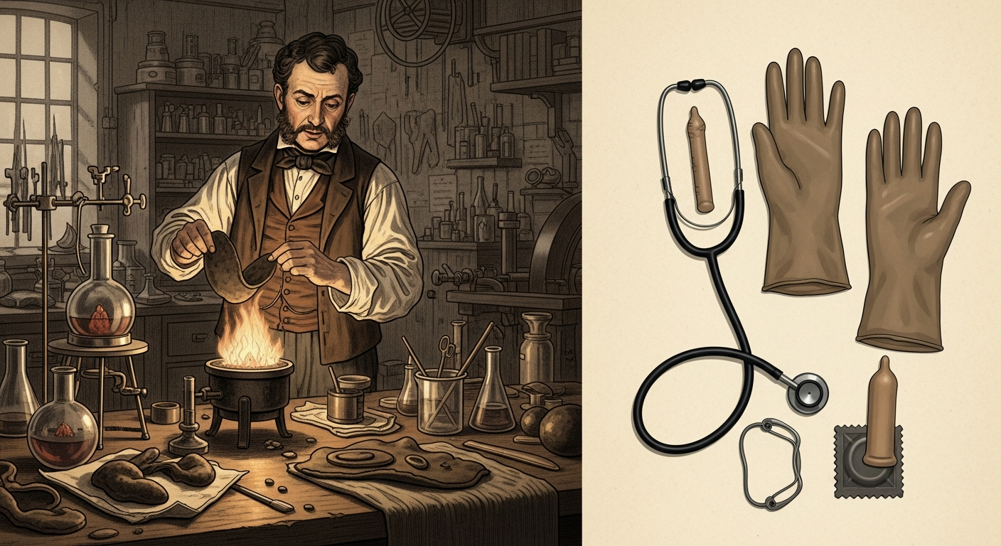 チャールズ・グッドイヤー。彼の発明した加硫ゴムは、聴診器のチューブを作り、手術用手袋を生み、輸血チューブを可能にし、コンドームを近代化し——医療の世界を根底から変えた。「タイヤの原料」が「無菌手術の実現」につながるまでの連鎖を辿ってみよう。