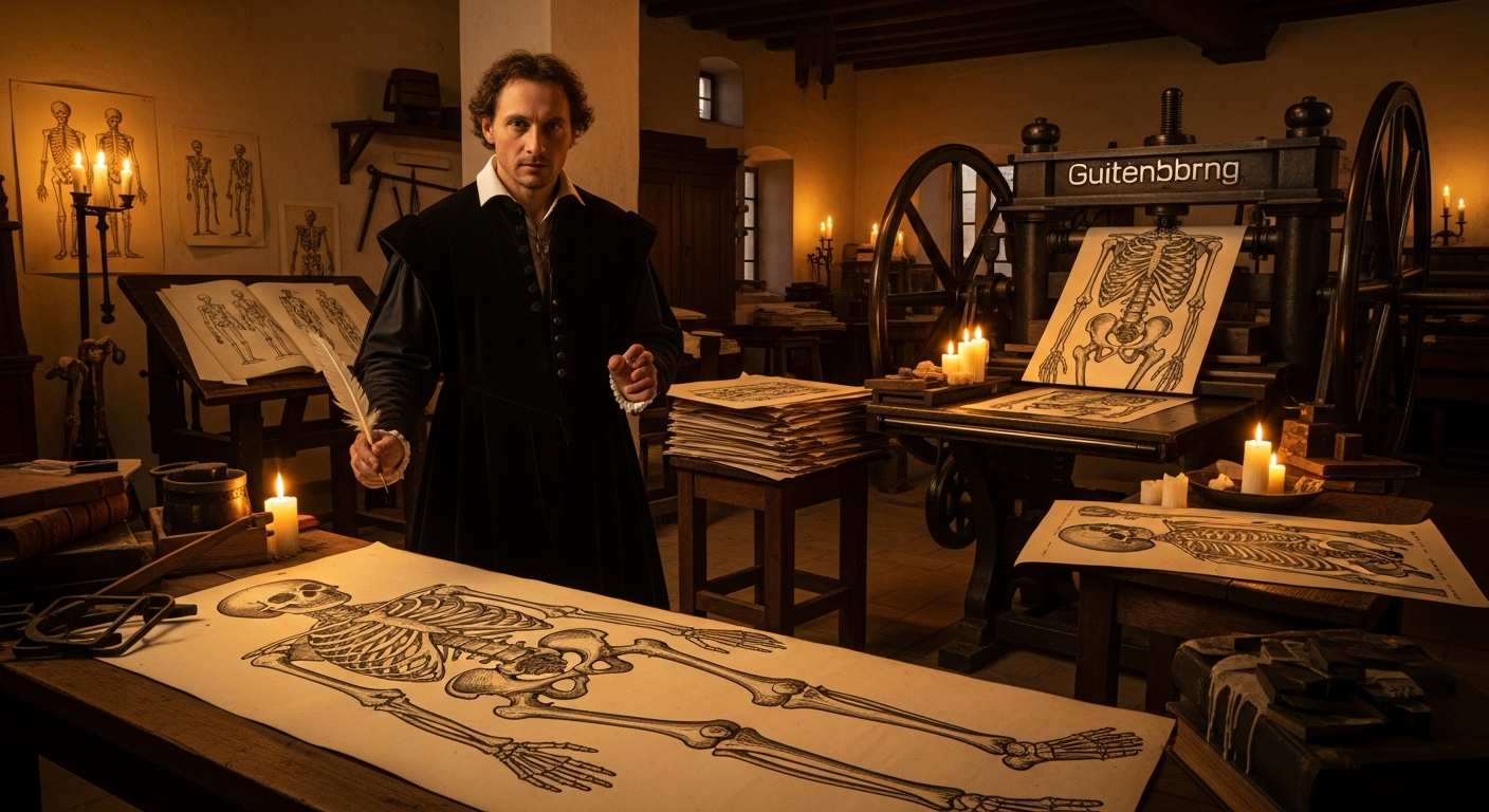 しかし1543年、アンドレアス・ヴェサリウスが出版した『人体の構造について(De Humani Corporis Fabrica)』は、活版印刷なしには存在しえなかった。そしてこの一冊が、1400年間支配してきた「間違った人体観」を覆した。印刷技術という通信革命が、医学知識を「正確に」した——その連鎖を追ってみよう。