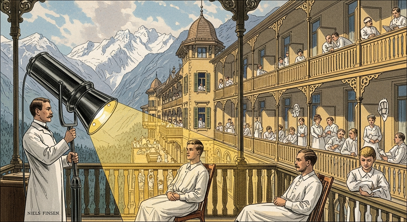 ゆっくりと体を蝕み、頬を紅潮させ、詩的な美しさすら帯びながら人を死に至らせた。その結核に対抗するため、医師たちは患者を山岳地帯や海岸に建てた療養施設——サナトリウム——に集めた。「清浄な空気と日光で治る」という信念に基づいたこの施設が、図らずも光線療法(phototherapy)という全く新しい医療分野を生み出した。